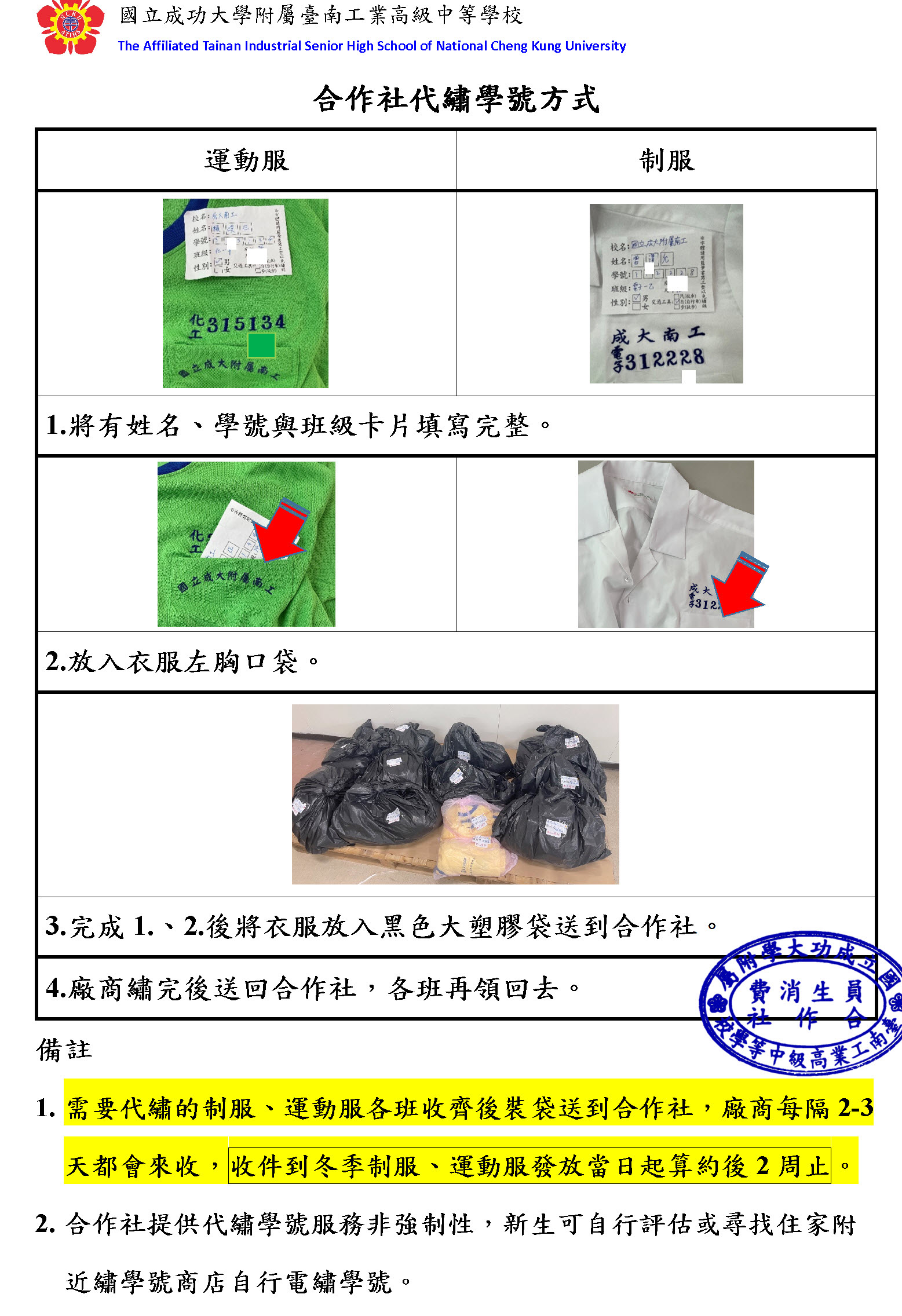 (一)、若服裝尺寸不合身,9月1日起可到合作社更換,如要更換尺寸,衣服不要過水洗。